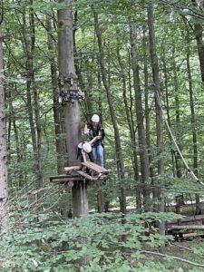 Am Zielort angelangt, erfolgte eine kurze Einweisung zum Verhalten im Kletterpark und die Sicherheitsausrüstung wurde angelegt. Dann ging es auch schon in luftige Höhe, denn alle Schülerinnen und Schüler mussten sich im ersten Parcours warmklettern. Einige Schülerinnen und Schüler hatten anfangs Schwierigkeiten mit der Höhe, haben sich dann jedoch überwunden, sodass am Ende alle mindestens einen Parcours bewältigen konnten. Die Highlights unter den Hindernissen waren die Hängebrücke, der Schlitten, das Skateboard, die Kletterwand und der Vogelkäfig.