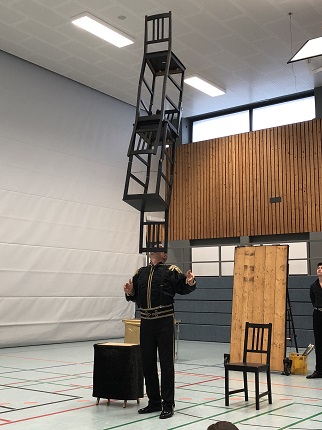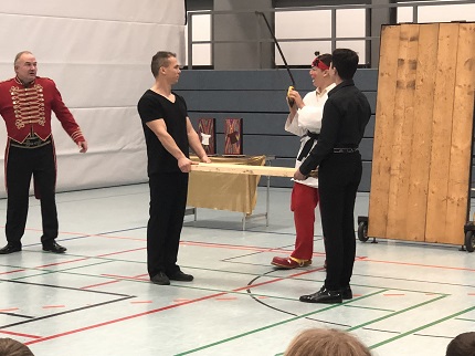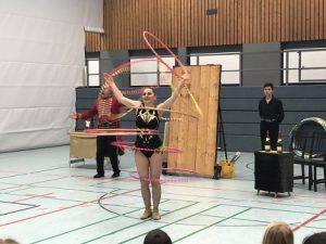 Präsentiert wurde ein rund einstündiges Programm mit Clownerie, Hula Hoop-Artistik, Zauberei und einem Messerwerfer. Die Schüler:innen und Lehrkräfte wurden in die Show mit einbezogen. Das bunte Vergnügen war eine nette Abwechslung zum Mathe- oder Deutschunterricht und kam sehr gut bei den Schüler:innen an.