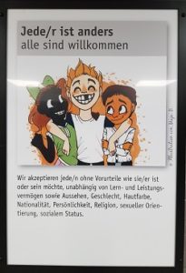 Die Zeichnungen wurden nun von einer Grafik-Agentur professionell aufbereitet und mit den kurzen Textabschnitten aus dem Leitbild der Schule versehen. Das Lehrerkollegium wählte aus den verschiedenen Layout-Entwürfen seinen Favoriten aus, der schließlich in den Druck gehen konnte. Jetzt haben Schüler*innen und Lehrerkräfte an beiden Schulstandorten ihr Leitbild stets vor Augen. Die sechs Leitsätze lauten: „Jede/r ist anders – alle sind willkommen“, „Hand-in-Hand – gemeinsam und miteinander“, „Auf gleicher Augenhöhe – respektvoller Umgang“, „Viele Sinne, viele Wege – optimal lernen“, „Augen auf – Verantwortung übernehmen“ und „Gesundheit – fördern und erhalten“.