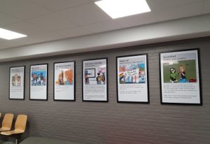 In den Rahmen sind die sechs Leitsätze aus dem Leitbild der Schule in Bild und Text dargestellt. Die colorierten Zeichnungen, die an einen Comic erinnern, wurden von Maja Bullwinkel angefertigt. Die Schülerin der Klasse 10c gewann mit ihrer künstlerischen Adaption des Schulleitbildes einen eigens dafür ausgeschriebenen Kunstwettbewerb im vergangenen Schuljahr. Als Preisgeld freuten sich Maja und ihre Klasse über 200 Euro und einen zusätzlichen Ausflugstag.