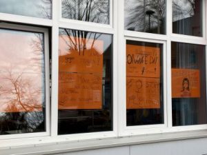 Die UN-Kampagne „Orange the World“ macht seit 1991 auf Gewalt aufmerksam. Am 25. November findet jährlich der Internationale Tag zur Beendigung der Gewalt gegen Frauen statt. Auch Schüler:innen aus dem 9. und 10. Jahrgang der Oste-Hamme-Schule setzten ein sichtbares Zeichen gegen Gewalt an Frauen, denn das Thema geht uns alle an. Jede dritte Frau erfährt statistisch mindestens einmal in ihrem Leben physische und/oder sexualisierte Gewalt. Die meisten Täter sind Männer, die den Frauen nahestehen. Die UN-Kampagne setzt darauf, Frauen und Mädchen in ihrer Vielfalt zu stärken, sie vor Gewalt zu schützen und ihnen Zugang zu Hilfssystemen zu verschaffen. Die Schüler:innen setzten sich auf unterschiedliche Weise mit der Problematik auseinander und gestalteten im Unterricht Plakate mit Aufrufen gegen Gewalt an Frauen und Mädchen. „Gewalt ist keine Liebe“, „Kein Mann hat das Recht, eine Frau zu schlagen“ oder einfach „Stopp die Gewalt gegen Frauen“ ist auf den Plakaten zu lesen, die derzeit die Fensterfront der Aula und des darüberliegenden Klassenraums schmücken. Mit der Plakataktion soll dem Thema mehr Sichtbarkeit verschafft werden. Angeregt wurde die Teilnahme an der Aktion von Frau Ehlers, die Gleichstellungsbeauftragte unserer Schule ist.