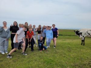 Wer wollte, konnte nun auch die Wassertemperatur des Kanals testen – einige nutzen die Möglichkeit und sprangen vom Steg oder vom SUP in das erfrischende Nass. Der Wettergott meinte es aber ja auch einfach gut an diesem Tag! Zum Abschluss des abwechslungsreichen und aktiven Wassersporttages und nachdem (fast) alle Gruppen ihre Gruppenarbeit beendet hatten, ging es gemeinsam auf den Deich. Die letzte Sporteinheit des Tages hieß „Gatter überklettern“. Oben wurde schließlich der Ausblick auf die Elbe genossen und eine der vielen Kühe wurde unfreiwillig Teil des Klassenfotos. Auch wenn der Abschied von der Kuh den Schüler:innen nicht leicht fiel, ging es gegen 16 Uhr mit den Elterntaxis wieder zurück nach Gnarrenburg.