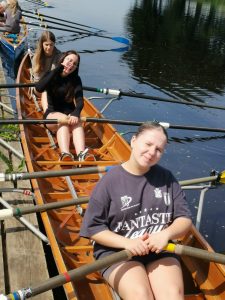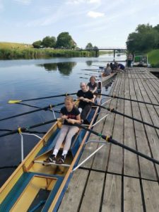 Am Zaun wurde anschließend noch das Drehen der Skulls (so heißen die „Paddel“ beim Rudern) geübt, damit im Boot das Aufdrehen der Blätter reibungsloser klappt. Danach wurde gewechselt und nach kurzer Zeit kannten alle Schüler:innen sowohl die Ruderbewegung als auch die wichtigsten Begriffe.