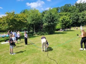 Auch an Land gab es viele Stationen, an denen die Schüler:innen ihre Geschicklichkeit erproben konnten. Wer schaffte den höchsten Füllstand beim Wassertransport mit Schwämmen? Wurfkraft und Treffsicherheit waren beim Wikinger-Schach-Tunier gefragt. Daneben gab es zahlreiche Kooperationsaufgaben mit interessanten Namen wie „Der bewegende Sitzkreis“, „Blinde Geometrie“ oder „Zauberstab“.