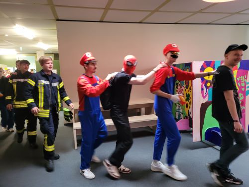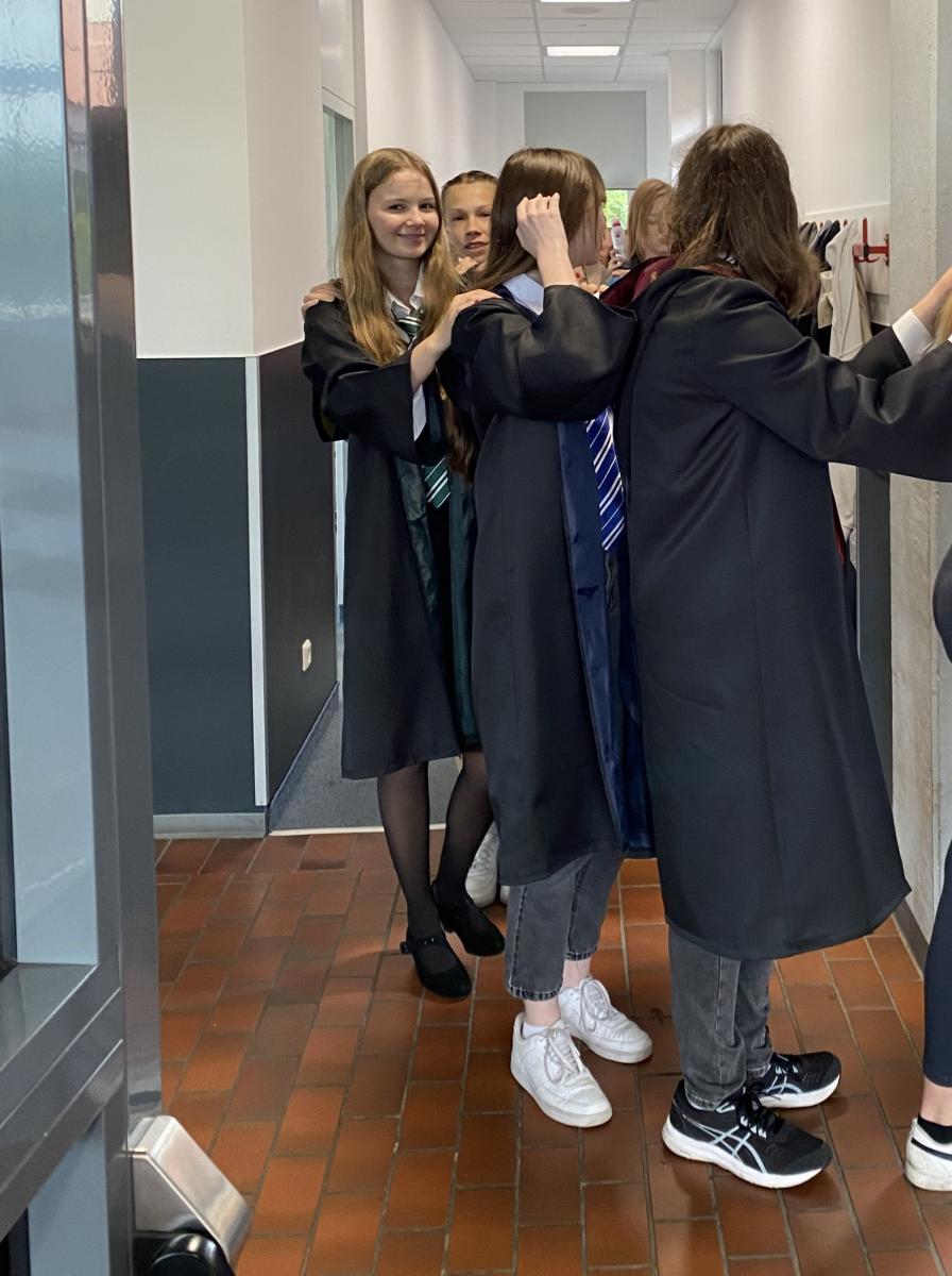 Der Fachbereich Kunst führte wieder ein Kunstprojekt mit den Absolvent:innen durch. Das Thema in diesem Jahr lautete: Selbstporträt. Die Schüler:innen zeichneten und fotografierten sich selbst und verfremdeten die Darstellung mit Mitteln der digitalen Bildbearbeitung, mit aufgeklebten Collageelementen oder ganz einfach mit der Schere, indem sie das Foto zerschnitten und die Splitterformen zu interessanten Arrangements wieder zusammensetzten. Die tollen Ergebnisse waren beim Sektempfang in der Schulaula zu bewundern. Das Gemeinschaftskunstwerk wird dauerhaft im Schulgebäude verbleiben, als Erinnerung an den Abschlussjahrgang.