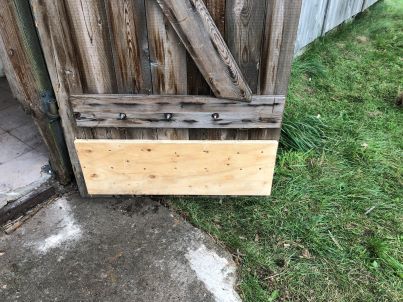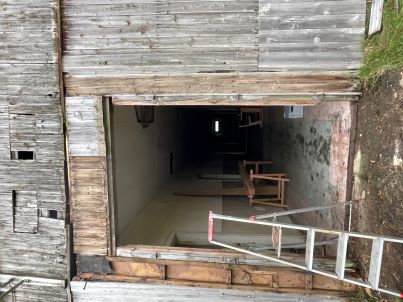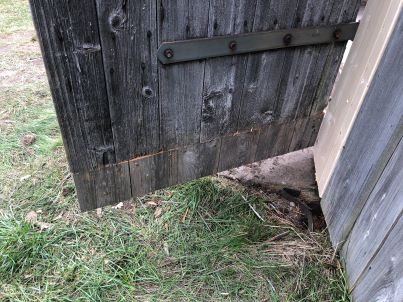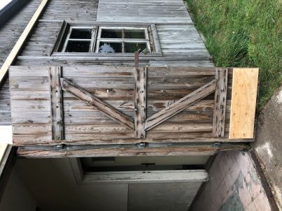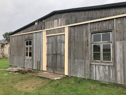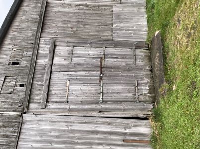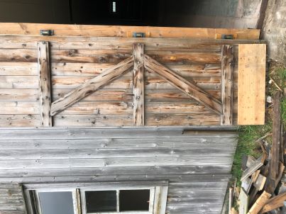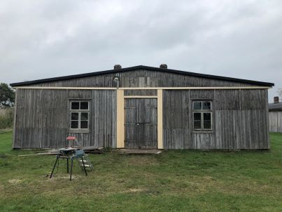 „Das Eingangstor von Baracke 3 war marode und nicht mehr zu schließen oder zu öffnen“, berichtet Holsten. Auch die Tragbalken des Tores sowie die Türen selbst seien teilweise verrottet gewesen. „Die Tragbalken wurden festgedübelt. Ein Balken musste erneuert werden. Die Türen wurden unten abgesägt und mit altem Holz wieder angefüttert. Nach dem Einsetzen der Türen wurden die Abdeckungen neben und über den Türen mit alten und neuen Brettern wieder hergestellt“, so Holsten. Auch über dem Toreingang mussten viele Bretter durch andere alte Bretter ersetzt werden.