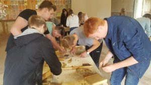 Um die zahlreichen verstorbenen sowjetischen Kriegsgefangenen, die lediglich in Massengräbern auf dem Lagerfriedhof begraben wurden, angemessen zu würdigen, werden Namensziegel angefertigt. In Zweierteams gestalteten die Schüler auf Basis einer Personalkarte und nach strengen Vorgaben ihren eigenen Tonziegel. Abschließend besichtigten die Klassen noch die Massen- und Einzelgräber auf dem Lagerfriedhof. Auch hier wurden die gravierenden Unterschiede, die zwischen den Nationen gemacht wurden, deutlich. Das Schildern persönlicher Einzelschicksale veranschaulichte den Schülern die Vergangenheit des Kriegsgefangenenlagers Sandbostel.